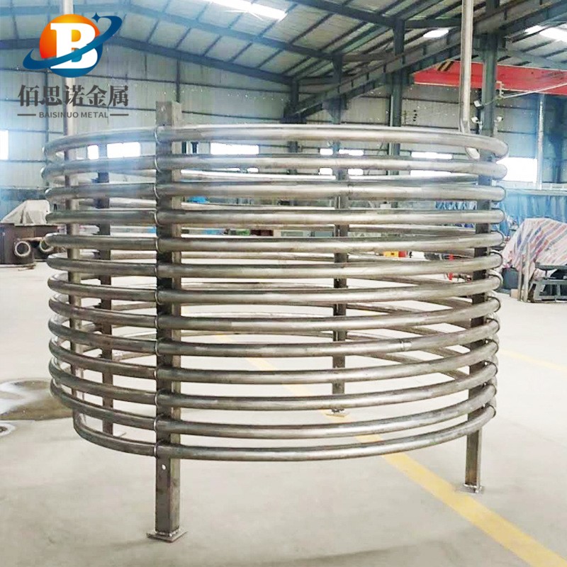 鈦盤管常用來作為容器內(nèi)部加熱和冷卻。盤管的固定方式有不可拆與可拆兩種,這要根據(jù)物料的情節(jié)程度及服飾情況決定,但在設(shè)計(jì)上盡可能用可拆式,以便于鈦盤管的清潔與檢修。